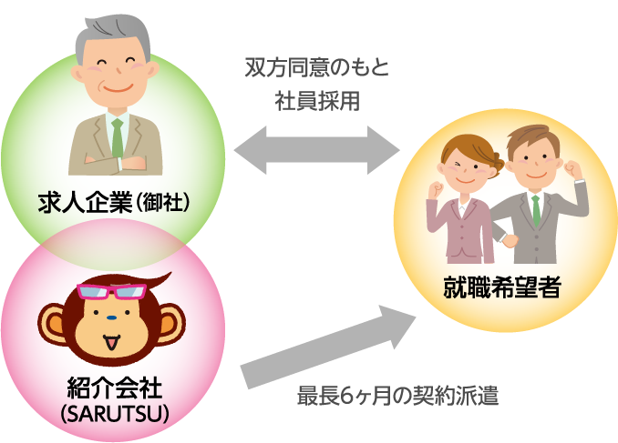 紹介予定派遣とは、直接雇用を前提として一定期間(最長6ヶ月)派遣を行い、派遣終了後に企業と派遣スタッフ双方が合意すれば雇用契約を結ぶサービスです。